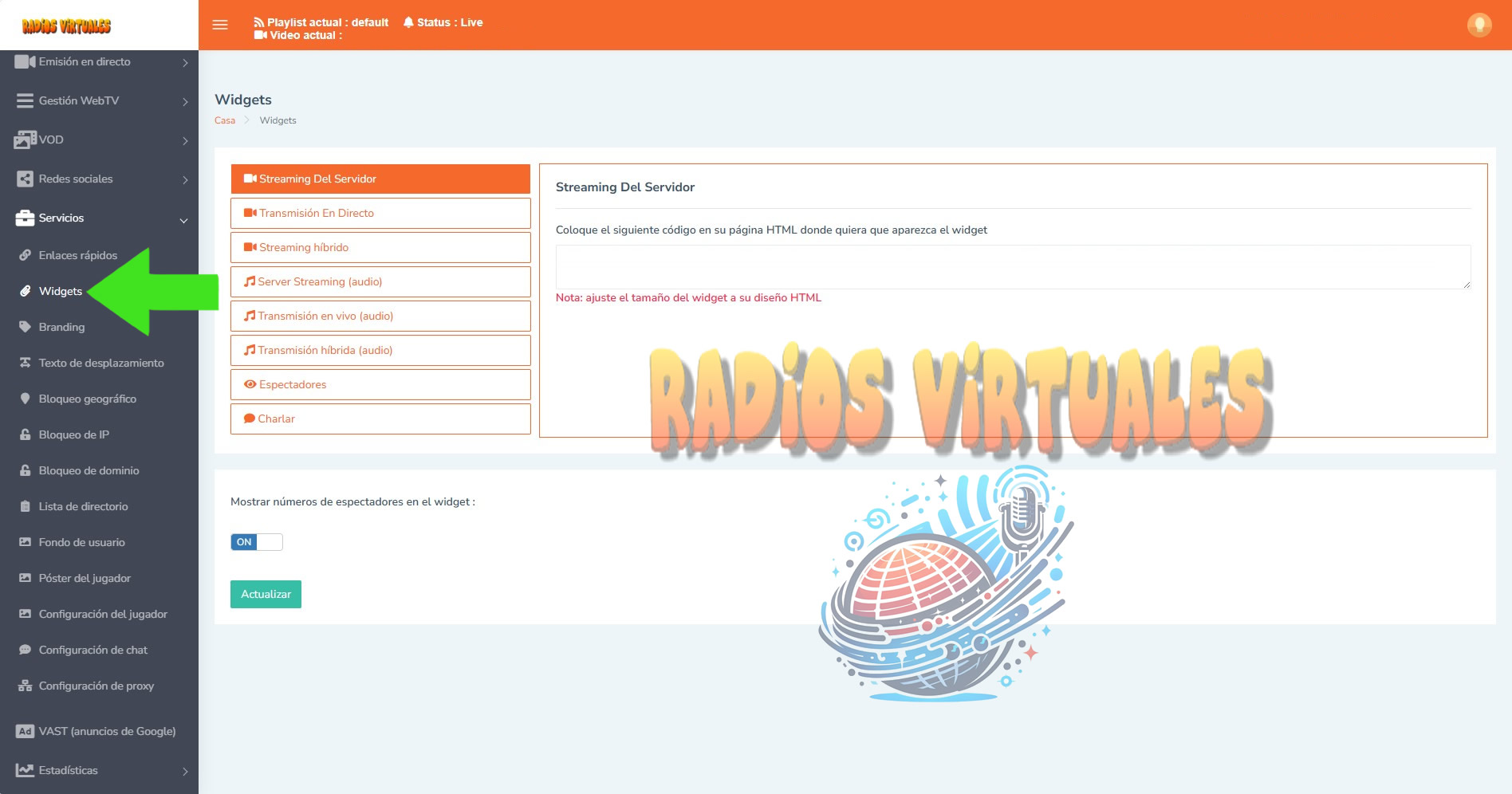 en tu panel Tienes varios Widgets y Enlaces Rápidos, para que Incrustes el reproductor en donde gustes.